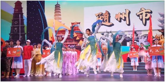 开幕式上,来自全省17个市(州)的代表队以舞蹈的形式展现各地风俗文化。随州被誉为“编钟古乐之乡”,为更好地凸显“编钟文化”,五眼桥小学精心编排了编钟乐舞。随着引领员和旗手的指引,随州代表队闪亮登场。合着音乐节拍,孩子们翩迁起舞,水袖轻扬,灵动飘逸,真乃是“翩