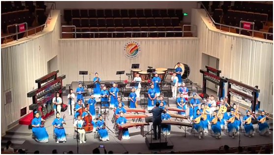 音乐厅内,五眼桥小学编钟艺术团原创器乐合奏《金色童年》精彩上演,该曲运用编钟、编磬、古筝、二胡、竹笛及各种打击声效器乐,钟磬合奏、筝鼓齐鸣、笛哨应和,曲风欢快活泼,旋律优美,情景交融,充满诗意。通过对自然景象和童年时光生活细节的生动描绘,表现了孩子们对生活的热爱、对未来的憧憬,抒发了新时代少年儿童将来为祖国建功立业的壮志豪情。整首曲子充满童真童趣,具有鲜明的时代特色。不仅适合孩子们听,也适合成年人回味和怀念自己的童年时光。孩子们娴熟的演奏技巧和积极向上的精神风貌给现场嘉宾带来全新的视听盛宴,现场观众赞不绝口。