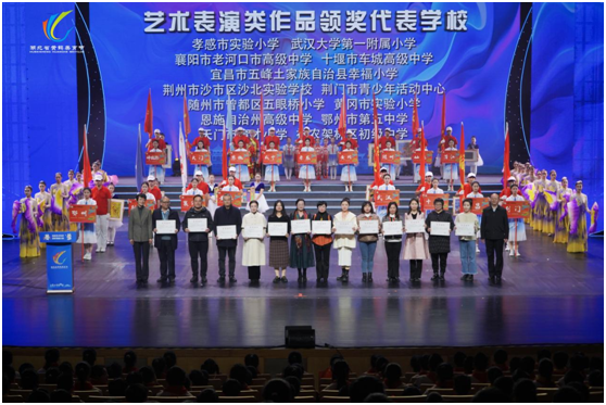 闭幕式上,曾都区五眼桥小学作为艺术表演类作品领奖代表学校上台领奖。