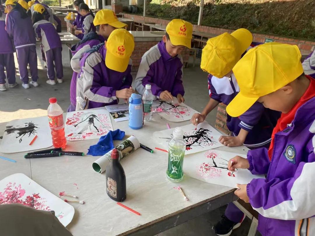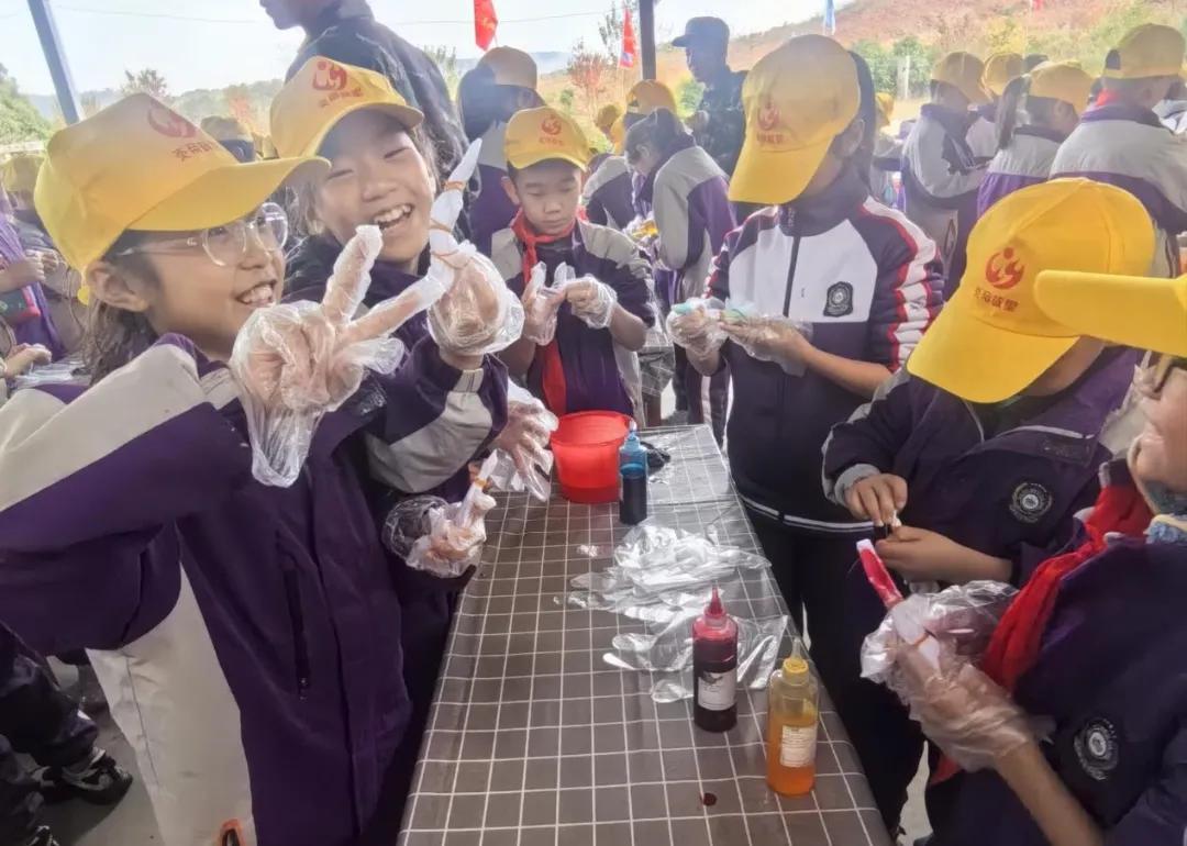 桃花岭研学基地精心准备了有趣又有意义的课程,他们用吸管吹出枝干,再用棉签点缀出桃花,好一幅“人面桃花相映红”的画面。豆浆是中国汉族的传统饮品,营养丰富,老少皆宜。亲手研磨出来的豆浆,除了味道鲜美外,更多的是一份成就感。“青,取之于蓝,而青于蓝。”散落在诗词里的自然“蓝”,落在布料上变成了颜色“蓝”,也就诞生了中华独特的染色工艺——扎染。经过传承,扎染有一百多种变化技法,颜色更加丰富,变化自然,趣味无穷。同学们怀揣着好奇和期待,专心致志地跟着老师动起手来。当一个个“盲盒”被打开的时候,现场发出一阵阵赞叹。每一件扎染作品都是独一无二的,不同的花形、不同的颜色,大家纷纷拿起“作品”合影留念。