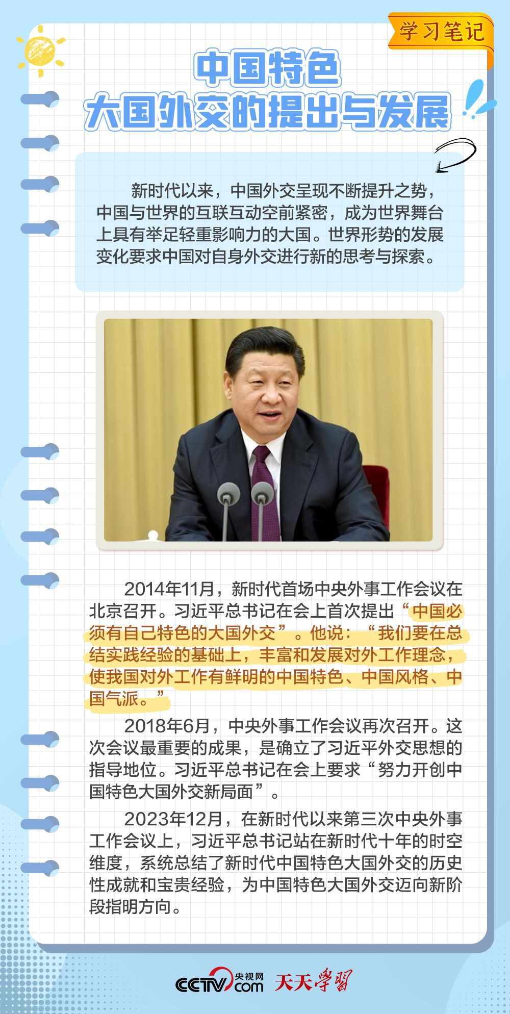 天天学习2014年11月,习近平总书记在中央外事工作会议上指出,中国必须有自己特色的大国外交。
