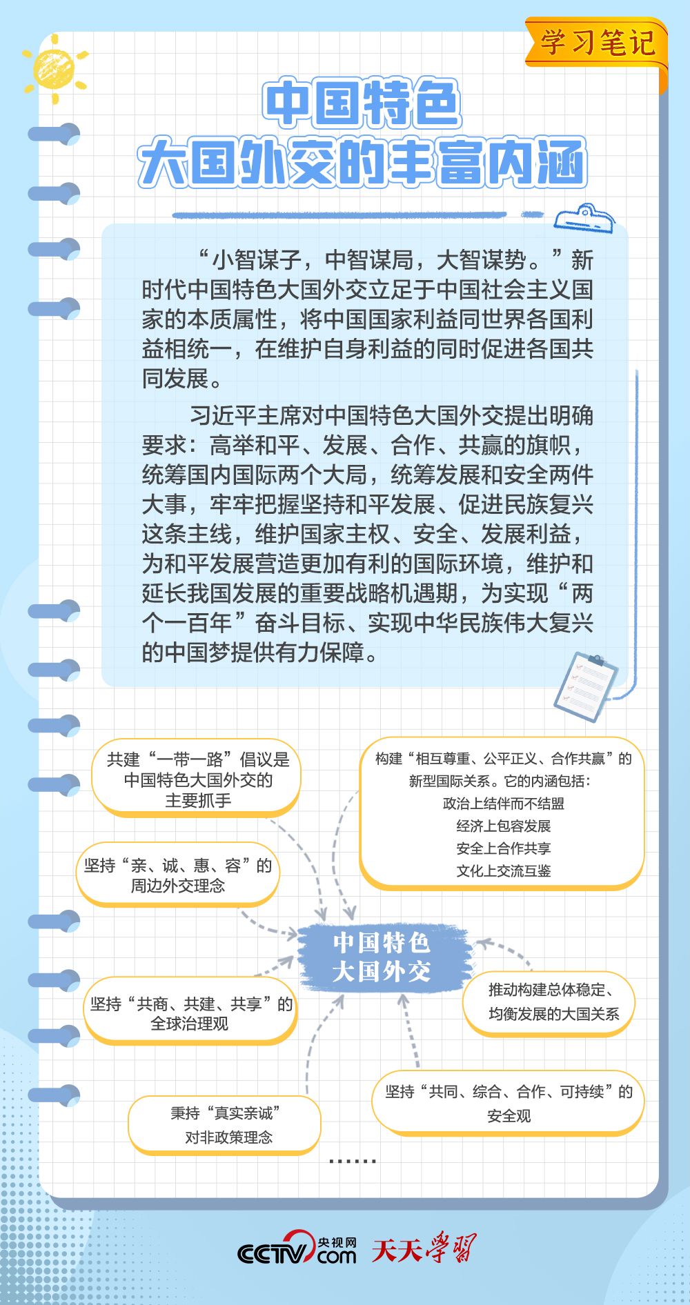 10年来,面对风云变幻的国际形势,中国特色大国外交扎实推进,形成了全方位、多层次、立体化的外交布局,为我国高质量发展营造了良好外部环境。中国特色大国外交提出10周年之际,《学习笔记》特梳理其内涵要义,与您一同感悟其中蕴含的“中国智慧”。