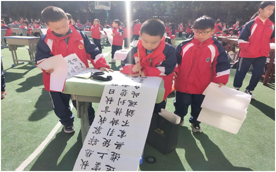 课间,学生“快乐书写”活动在学校大操场盛大举行。曾都区实验小学200余名学生在金色的阳光下,向与会嘉宾展示了自己优秀的书写能力、剪纸特长和学校的艺术教育成果。孩子们的出色表现,赢得现场观看的老师和专家们的盛赞和好评。