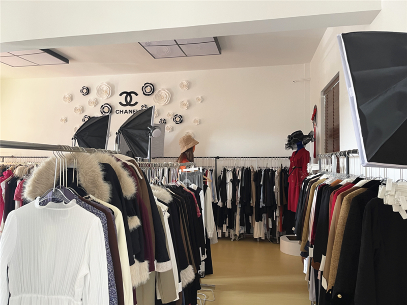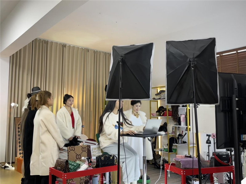 走进该公司办公区,各式各样的当季服装整齐放置在衣架上,工作人员正在清点服装数目。直播室内,主播一边试穿衣服展示上身效果,一边通过直播间向粉丝详细地介绍衣服面料成分、做工、款式等。