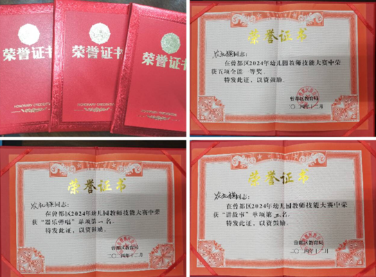 随州新闻网讯 (通讯员 冯晓平 何丹)12月6日,一场激动人心的幼儿园教师五项全能比赛在曾都区第一幼儿园落下帷幕,文峰学校附属幼儿园农礼旗老师凭借出色表现荣获“曾都区2024年幼儿园教师技能大赛”五项全能一等奖,器乐弹唱单项第一名、讲故事单项第三名的好成绩,成为赛事焦点。此次比赛全面考验教师的绘画、器乐弹唱、舞蹈、讲故事及现场问答五项能力,旨在促进教师专业成长,提升幼儿教育质量。