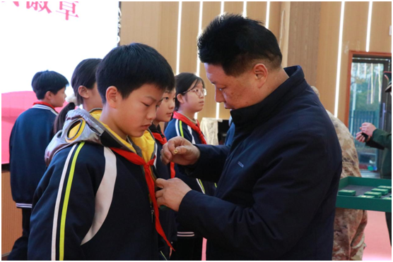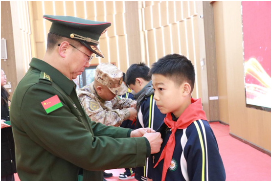 曾都区教育局党组成员、副局长樊力同军地领导一起为学生代表佩戴国防教育徽章,激励学生传承红色基因,担当强国使命。