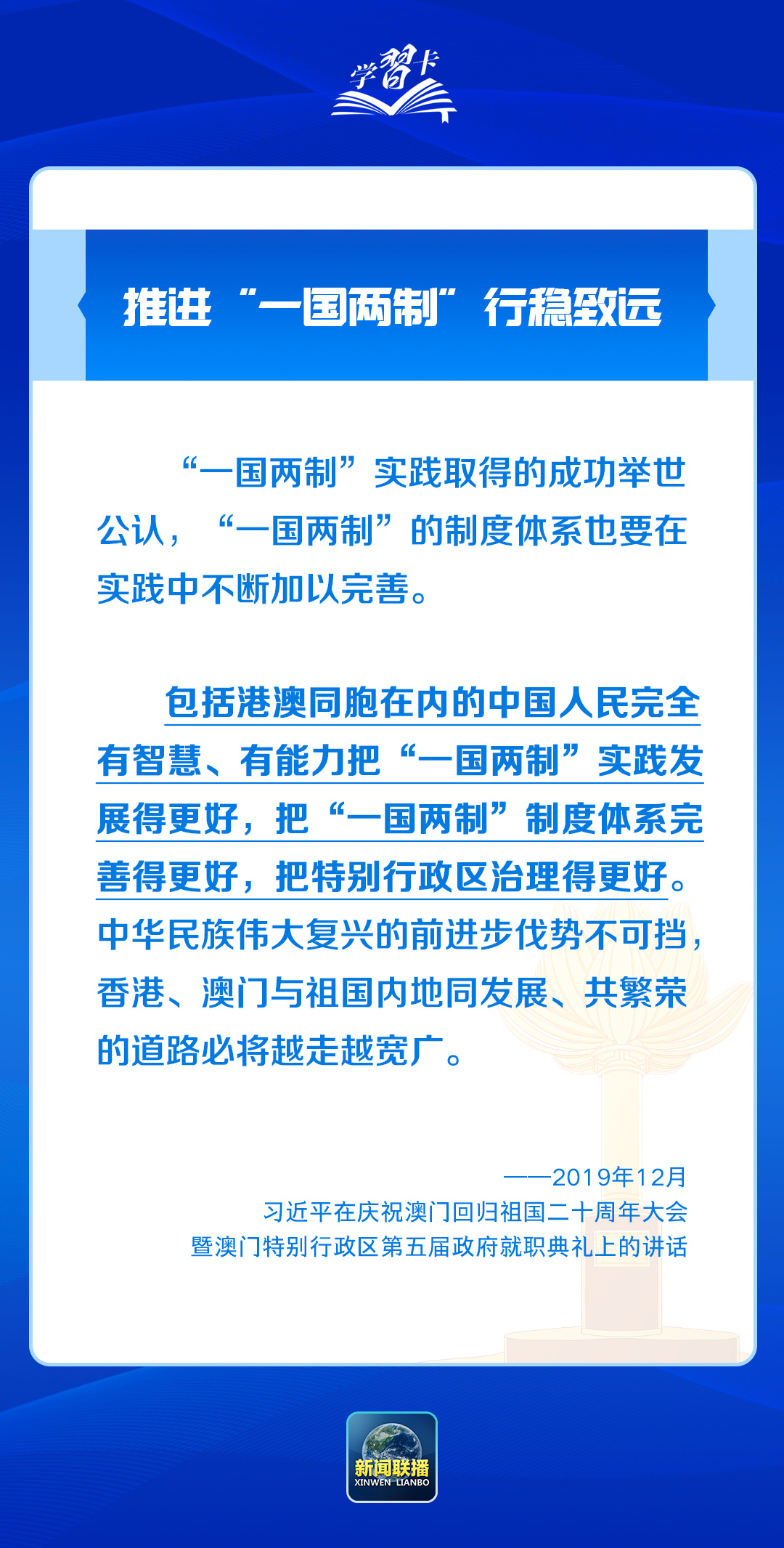 习近平主席一直心系澳门,为澳门全面准确、坚定不移贯彻“一国两制”、保持长期繁荣稳定指明前进方向。