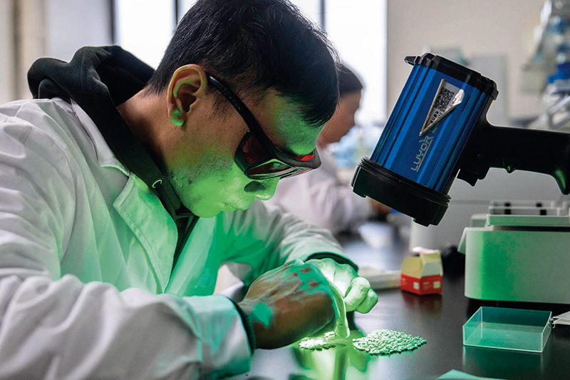 在湖南杂交水稻研究中心,工作人员通过荧光法进行水稻样本分析(2024年11月25日摄) 陈思汗摄 / 本刊