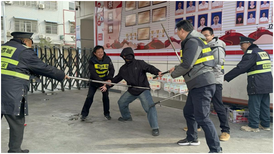 上午10时,警情发生,学校安保人员迅速按下“一键报警按钮”报警。学校迅速启动反恐防暴应急预案,应急防暴组成员手持器械迅速赶到学校大门口,处置突发事件。只见一蒙面“歹徒”手持凶器企图闯入校园,班级教师沉着冷静,关好门窗,快速组织好学生隐蔽躲藏,全力以赴保障学生的安全。安保人员和应急防暴小组成员手持防暴钢叉等器械与“歹徒”进行对峙、周旋,最终成功将“歹徒”制服。