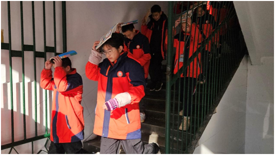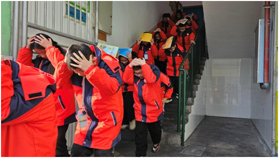 演练过程,彰显有序高效。室内避险时,同学们沉着冷静,以书本护头,展现出良好的应急素养。紧急疏散时,同学们有条不紊,体现了“快、静、齐”的要求。整场演练,师生配合默契,达到了演练的目的。
