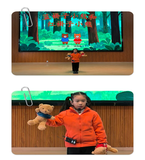二(1)二(2)班同学带来的朗诵《今天,明天》声声入耳,表达出孩子们对未来的憧憬与一往无前的信心。一(1)班同学用生动的表演让我们沉浸其中——《聪明的狐狸列娜》。一(2)班同学正向我们娓娓道来——《蜘蛛开店》。二(7)班同学带我们一起解密——《小狐狸卖烦恼》。一(3)班同学带我们体会了这发人深省的故事——《小猪的理想》。一(4)班同学带我们一同见证这扣人心弦的故事——《狼和鸭子》。一(5)班同学带大家感受到了那震撼人心的力量——《小英雄海娃》。一(6)班同学让我们感受那纯真无邪的诚实魅力——《蓝褂子小熊和红褂子小熊》。二(3)班和二(6)班的同学们为大家带来的精彩节目《童说节气》,每一位表演者都像是一位文化使者,用他们的声音传递着经典的智慧和力量。二(4)和二(5)班同学为带来的朗诵《诗词里的李白》仿佛带领我们穿越时空,再次感受诗仙李白的风采与神韵。
