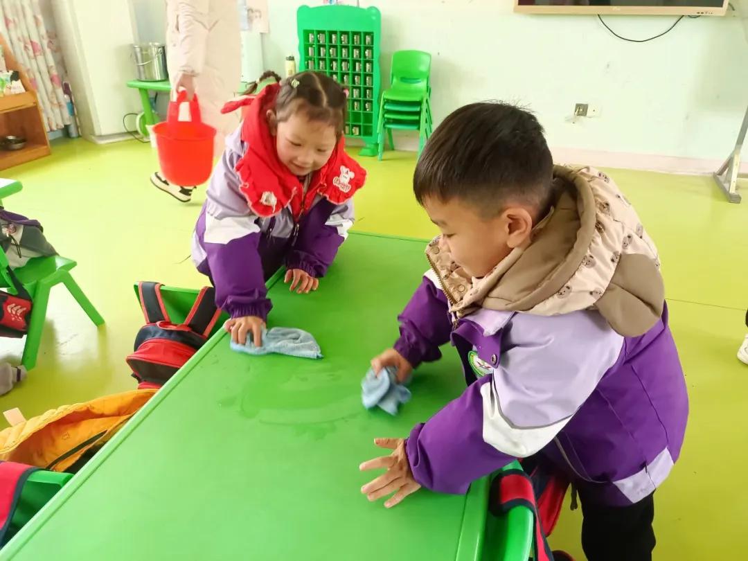 塔湾中心幼儿园的小朋友们在老师带领下对班级各区域进行了清洁打扫,在实际行动中养成爱清洁讲卫生的好习惯。