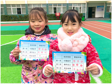 本次测评以趣味性闯关游戏代替传统纸笔考试。在“识字能手”“背诵达人”“妙语连珠”的语文关卡中,孩子们声情并茂地朗读、背诵,展现扎实的语言功底;“计算能手”“操作达人”“综合运用”的数学关卡,考验了孩子们的运算能力和空间思维;孩子们凭借生活常识和实践能力,自信应对各类挑战,不少孩子都获得了三星的最高荣耀!