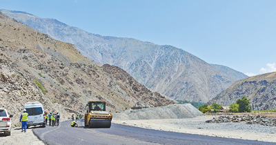 中塔公路二期项目建设现场,两国工作人员正在平整沥青路面。本报记者 程是颉摄
