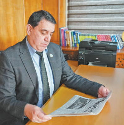 苏赫罗普·劳夫佐达阅读塔吉克斯坦《人民论坛报》与中国相关的报道。刘帅杰摄