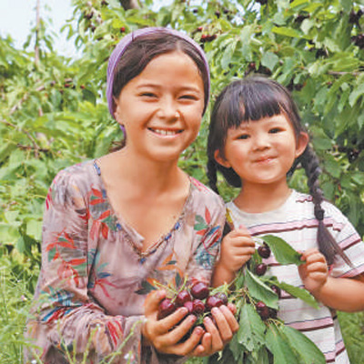在中塔合建的吉萨尔樱桃园,当地小女孩展示刚摘下的樱桃。本报记者 颜欢摄