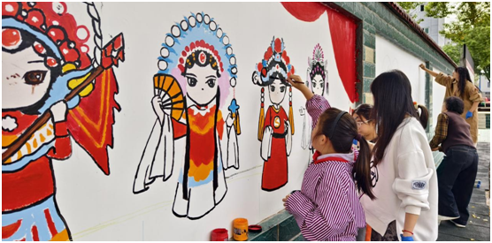 “老师,这次墙绘可算圆了我的梦!我一直都特别羡慕画家能在墙上画画……”“老师,这面墙画完啦,我想写段宣传语,到时候给来参观的同学讲解。”“老师,在墙上写书法和在纸上写完全是两码事,我还得下苦功夫好好练练。”……一句句真挚话语,满溢着小画家们内心深处的喜悦和收获。墙绘不仅提升了学生的艺术素养,还让学生在创作中激发对艺术的热爱、在校园文化建设中增强主人公精神和责任感。