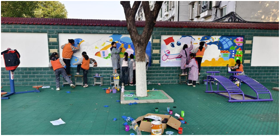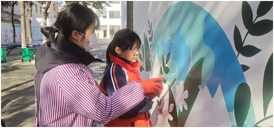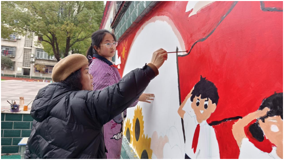 在墙绘过程中,小画家们在老师的悉心指导下全情投入。他们一丝不苟地打底稿,凭借对色彩的敏锐感知精心调色,以细腻笔触细致描绘,手中画笔如神奇的精灵,传递着他们对校园深沉的热爱,以及对艺术执着的追求 。