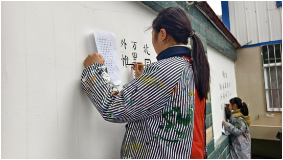“之前从没有在墙上绘画,这对我来说是一次大胆且充满挑战的尝试……”青年美术老师刘馨月在接受这次活动时说道。为了让墙绘活动能够成功举办,她和另外几名美术老师带着四名学生,利用每天中午休息的时间,先在一面稍小一些的墙上练习。他们秉持着对艺术的热忱与执着,反复尝试、不断改进。功夫不负有心人,在他们的努力下,第一面以“书香校园”为主题的墙绘作品惊艳亮相。有了成功的经验,接下来便是组织更多热爱书画的学生参与到活动中来。刘馨月老师运用多媒体课件,毫无保留地向学生传授如何巧妙设计墙绘画稿、精准调色等关键技巧。
