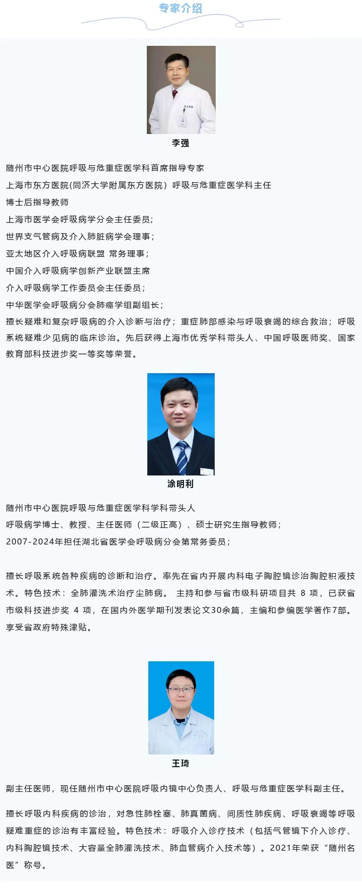 为了进一步加强呼吸与危重症医学科规范化建设,提升呼吸系统疾病诊疗能力,整合优质医疗资源,改善患者就医体验,2025年1月15日,随州市中心医院呼吸综合诊疗中心正式成立。聘请国内著名呼吸病学专家,上海市东方医院(同济大学附属东方医院)李强教授作为首席指导专家,开展难治性呼吸道疾病镜下治疗等高精尖技术,提升鄂北区域医疗服务水平。