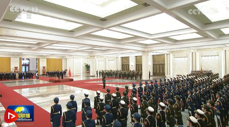 天安门广场鸣放21响礼炮,礼兵列队致敬。两国元首登上检阅台,军乐团奏中巴两国国歌。扎尔达里在习近平陪同下检阅中国人民解放军仪仗队,并观看分列式。