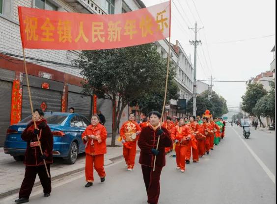 随后,演出队伍走上街头,巡游表演。大家沿着幸福路、胜利路到朝阳街、水晶街,一路敲锣打鼓,一路笑语欢歌。所到之处,锣鼓喧天,人身鼎沸,气氛热烈。腰鼓队、彩船队、手球舞队轮番上演,大家喜笑颜开,精神饱满,用铿锵激越的鼓点,热忱奔放的节奏,舞出了幸福愿景,奏响了盛世欢歌。“祝全镇人民新年快乐!”“给全镇人民拜年!”美好的祝愿、精彩的演出,引得沿街商户和过往群众驻足欣赏,大家纷纷用手机记录着这美好的瞬间。