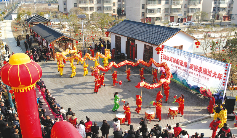 2月10日,曾都区涢水街道白桃村举行逛庙会·闹元宵活动。威风锣鼓、舞龙舞狮、采莲船、民乐表演等传统节目吸引了周边众多居民前往观看。(随州日报全媒记者徐斌摄)