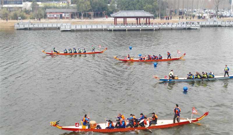 2月12日,2025年随州市“体育过大年”龙舟桨板赛在白云湖激情开赛,随州市水上运动协会和随州市冬泳协会组织的4支龙舟队伍在白云湖上劈波斩浪,以拼搏奋进的姿态迎接“开门红”。(随州日报全媒记者徐斌摄)