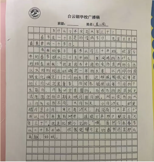 只要愿意学习,哪里都是课堂。有的队员将教室搬到了课外,开展了过年民俗文化调查。他们通过查阅大量资料、走访本地民俗专家和长辈,深入探究随州本地过年的传统习俗、历史渊源和文化内涵,并精心整理成内容详实的调查报告。比如:为什么今年没有大年三十?且看智多星们如何解答吧。