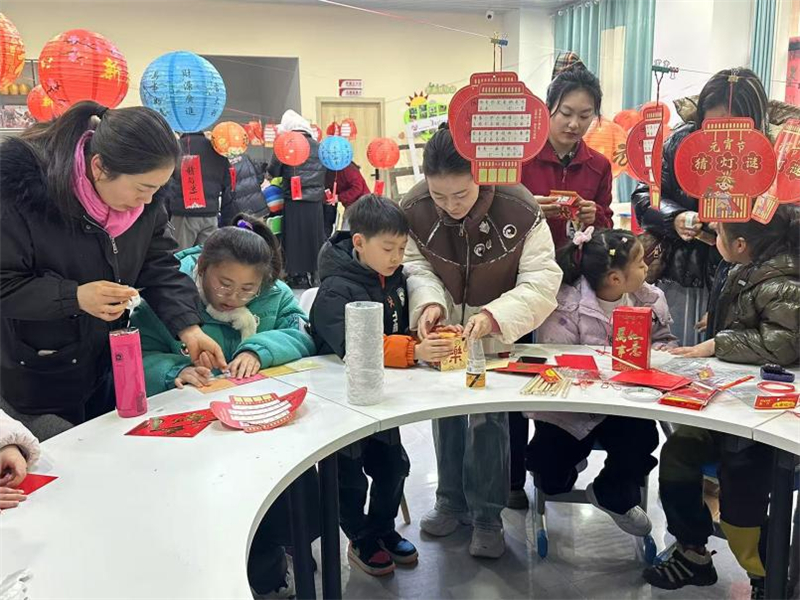 社区志愿者以趣味盎然的方式引领孩子们了解元宵节的深厚历史与多彩习俗,让他们深切感受传统文化的独特魅力,并引导他们多读书,读好书。随后,家长与孩子们围坐一堂,共同沉浸在制作灯笼的乐趣中。他们或低头专注剪裁,或相视一笑粘贴,每一次折叠、每一次拼接,都凝聚着亲子间的默契与爱意。彩纸翻飞间,一盏盏形态各异、色彩斑斓的灯笼跃然眼前,宛如点亮了孩子们心中的创意之光,映照出亲子合作的温馨画面。