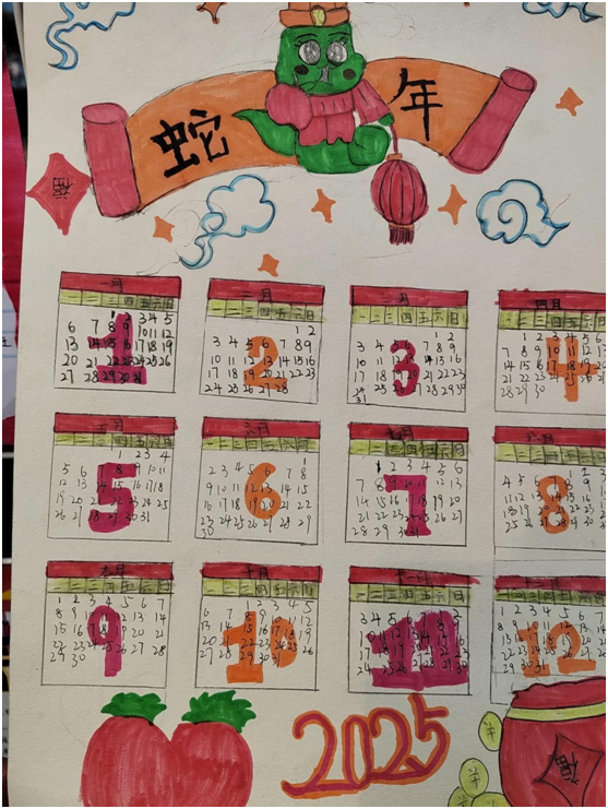 新年日历DIY。孩子们发挥想象力,设计制作出独一无二的2025年日历。日历上,不仅有精美的图案,还记录着孩子们对新一年的期待和目标。