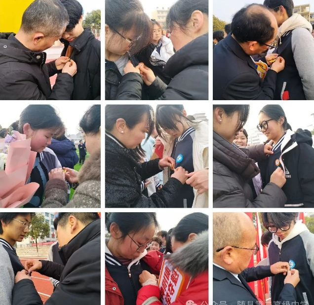 班主任、老师们、家长们拿起成人礼徽章,别在学生衣襟上。金属的凉意与青春的热血相拥,徽章上跃动的光芒,是师者用半生书写的期望。当“成人”的誓言在晨光中回荡,粉笔灰化作银河,通往未来的方向。