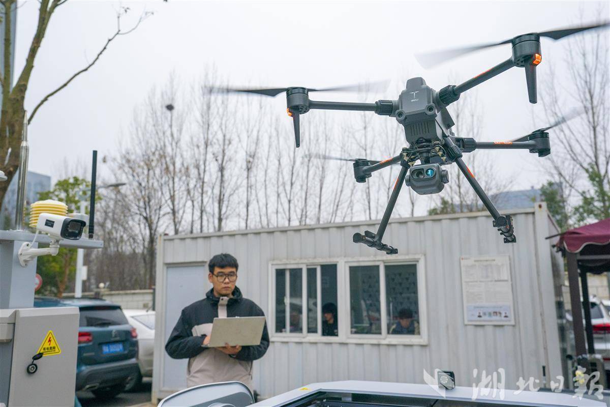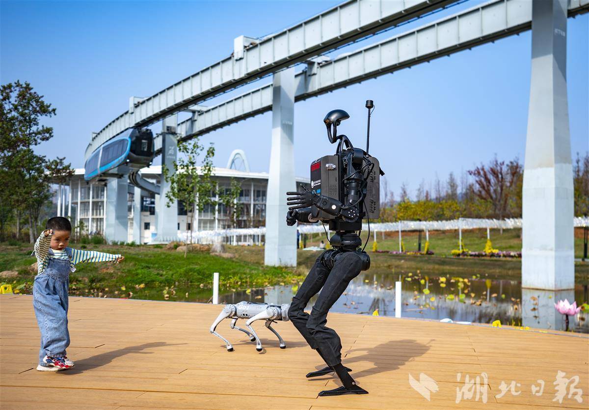 光谷空轨下,“武汉造”机器人与儿童共舞。