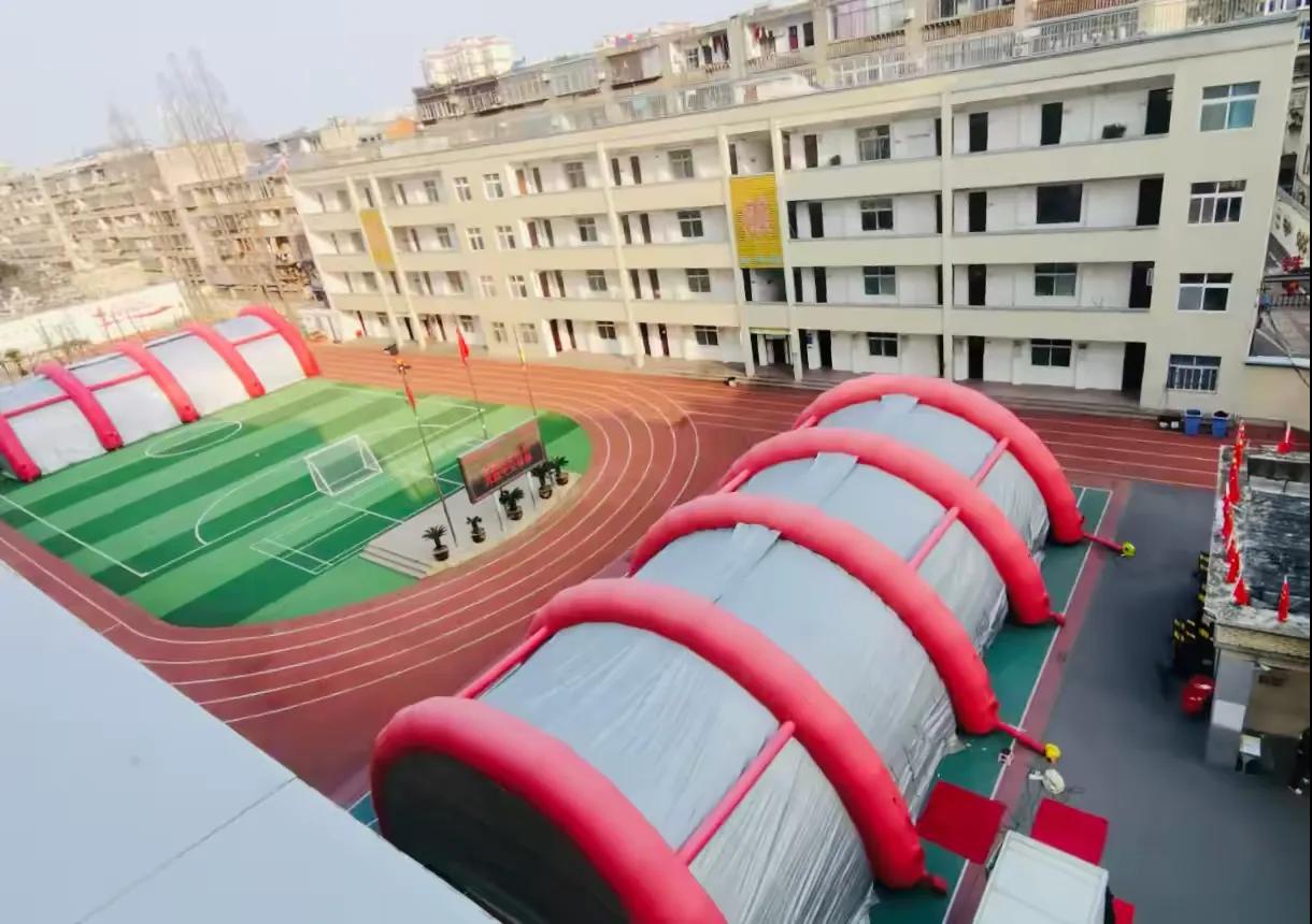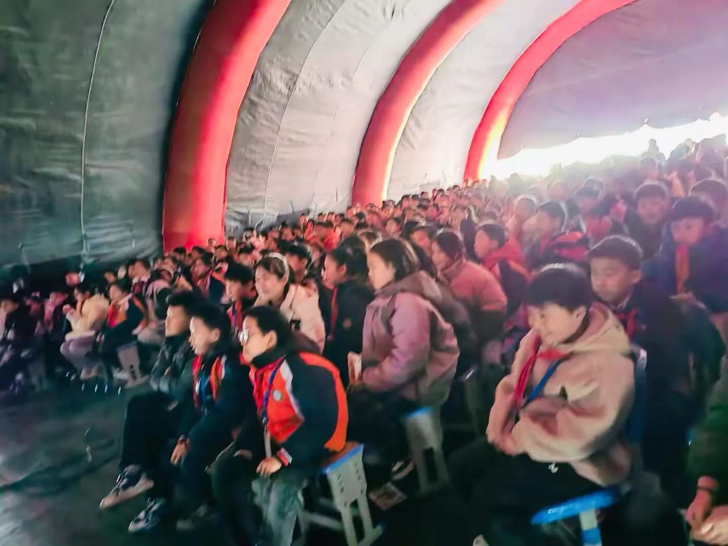 为满足不同年龄段学生的认知需求,学校在操场搭建起两个主题电影棚。高年级学生齐聚"红色光影"影棚,观看抗战喜剧电影《举起手来》。影片以诙谐幽默的叙事展现抗战烽火,既有"潘长江式"的滑稽表演引发阵阵欢笑,更通过小人物的家国情怀让同学们在轻松氛围中感悟民族精神。低年级学生则在"童趣天地"影棚观看经典动画《哪吒闹海》,绚丽的传统美术风格与勇敢无畏的小英雄形象深深吸引着孩子们的目光,不少学生随着剧情挥舞小手,模仿起哪吒"我命由我不由天"的经典台词。