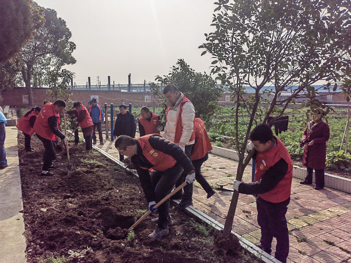 植树现场,志愿者们几人一组,分工明确,干劲十足。有人挥锹挖坑,有人扶正树苗,有人培土填埋、有人提桶浇水,配合默契,大家都积极投身于植树活动中。参加植树的党员志愿者说,“我们要号召身边人,牢固树立绿色低碳意识,坚持不懈地植绿、护绿,为美丽乡村增加更多的绿色,为低碳社会尽心出力。”