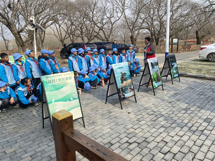 同学们在淮河国家湿地公园发展保护中心工作人员的带领下边游学边认识沿途遇到的植物和动物。