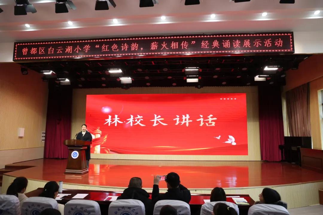 活动伊始,曾都区白云湖小学校长林海艳在致辞中强调,红色经典诗文是中华文化的瑰宝,希望同学们通过诵读活动,感受经典之美,领悟经典之智,传承经典之魂,号召全校师生更加积极地投身到经典诵读活动中来,让经典诵读成为我们生活的一部分,让中华优秀传统文化在校园里生根发芽,开花结果。