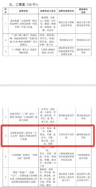 近日,从湖北省高职高专院校党建研究会传来喜讯,随州职业技术学院专用汽车与应急产业学院党总支报送的《高等职业院校二级学院“五心五育”党建工作模式研究与实践》荣获首届党建工作成果二等奖。