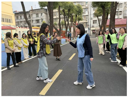 “鼓动人心” 环节,老师们齐心协力拉着绳索,控制鼓面的平衡,让球在鼓面上持续跳动。大家屏气敛息,眼神专注,每一次球的跳动都伴随着阵阵欢呼与加油声。这一项目让老师们深刻体会到团队协作和默契配合的重要性。