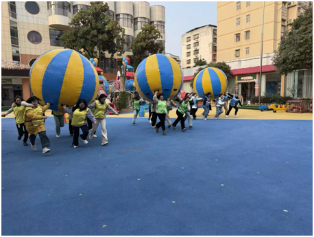 运转乾坤项目中,巨大的充气球被老师们高高举起,大家步伐一致,口号响亮,向着终点全力冲刺。比赛过程中,虽有时会偏离方向,但老师们总能迅速调整策略,重新找回节奏,展现出顽强的毅力和拼搏精神。
