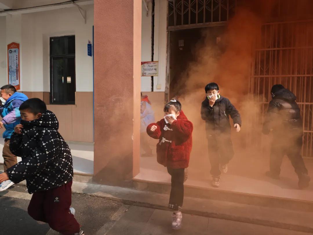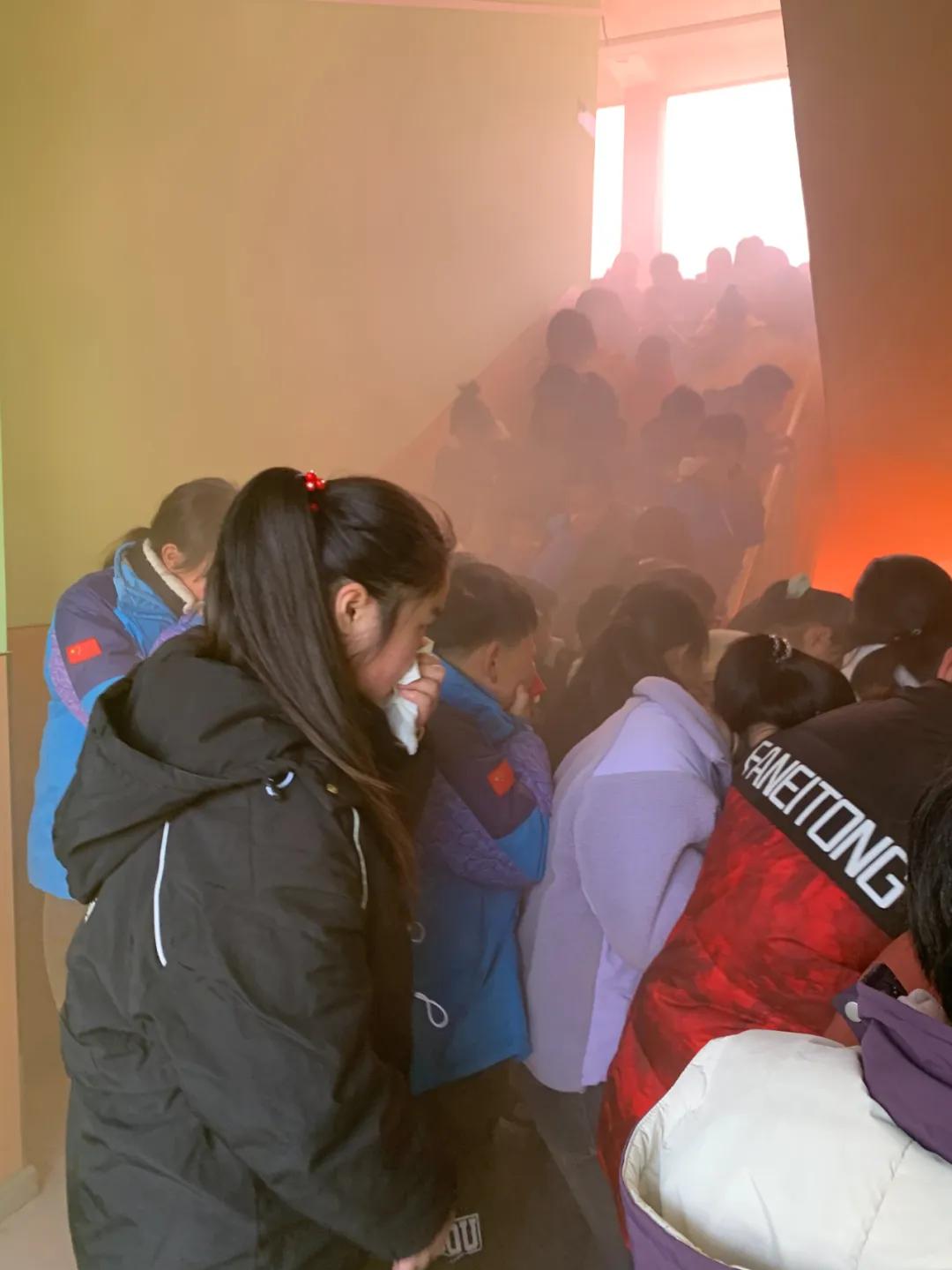 10点20分警报响起,应急疏散演练正式开始。各楼层负责老师在第一时间到达所在楼层指挥疏散学生。学生们听到广播后,捂住口鼻,弯腰贴墙按照指定路线开始有序疏散。在老师们的指挥下,全体学生在3分21秒的时间里,安全迅速地撤离到学校操场的安全地带。