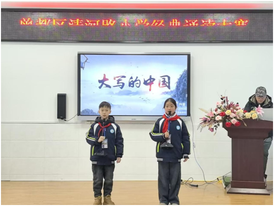 四(1)班宋承峻、薛允菡同学诵读《大写的中国》,彰显属于少年的独特飒爽风采。孩子们用声音勾勒祖国壮丽山河,诵出历史厚重与今朝辉煌。从他们对祖国缓缓的深情告白,领略到大国无限魅力。