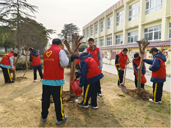 政教处带领各年级选派的8名代表,拿着铁锹、水桶来到分配区域。同学们分工明确,有的挥锹铲土,有的扶树填坑,有的浇水灌溉,每个环节都认真细致。现场气氛热烈,大家齐心协力,让原本荒芜的土地焕发出新的生机。