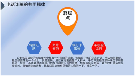 吴警官向同学们详细介绍了什么是电信诈骗、电信诈骗的共同规律、五招补救措施。防范电信诈骗要做到“三不一要”:不透露、不轻信、不转账、要及时报案。谨防电信诈骗安全教育给学生们带来了很好的警示作用。