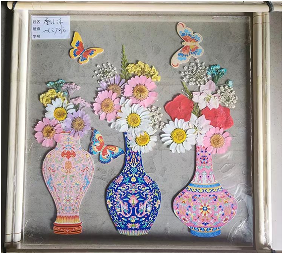 三只古色古香的大花瓶被簇拥着清新雅致的小菊花和翩跹飞舞的小蝴蝶。它体现了孩子对色彩和谐布局的理解力,同时也表明老师极其重视培养孩子美感意识、五育并举、全面发展。