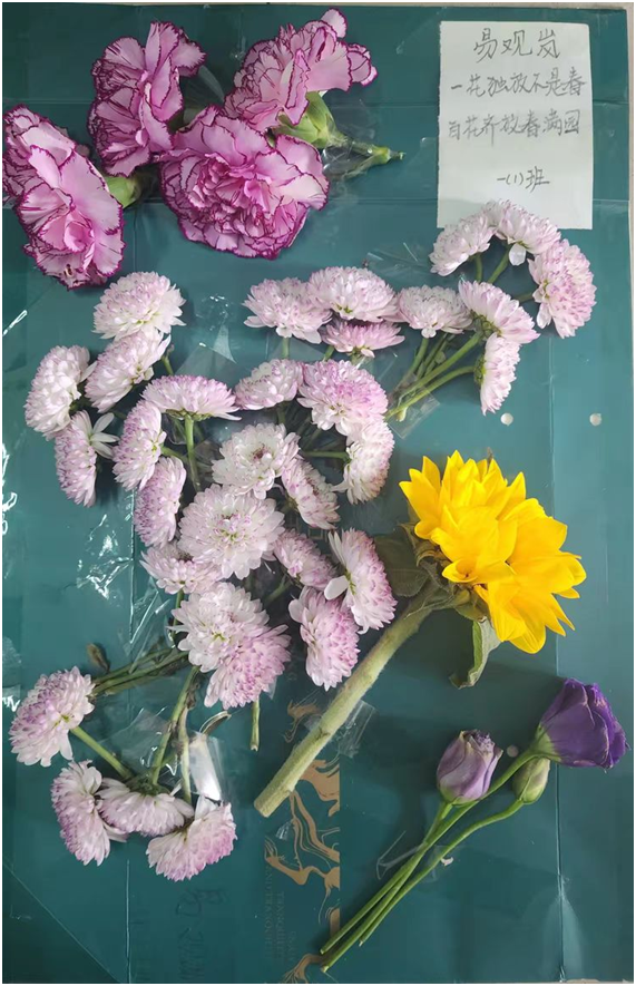 向日葵、康乃馨以及小菊花等汇聚成一片绚丽多彩的花海。每一种颜色和形状因独特而和谐,共同构成一张视觉上的盛宴图。“一花独放不是春,百花齐放春满园。”这幅繁华景象象征着生命的坚韧不屈与浓烈爱意,也为我们忙碌的生活带来片刻宁静和朴实的美好,同时也表达了孩子们共同进步的决心和对祖国文化繁荣昌盛的美好祝愿!