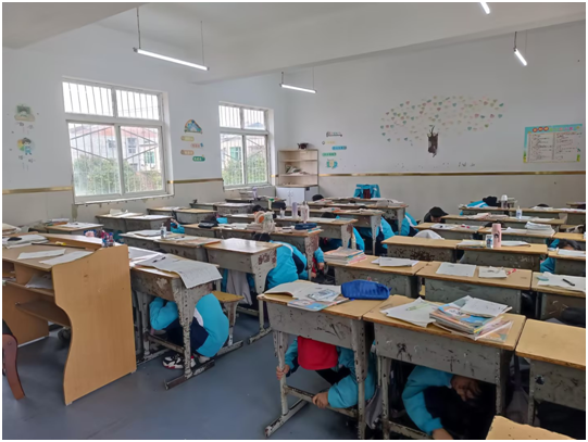 随着第一声警报声的响起,防震演练正式开始。学生们迅速躲到课桌下或墙角等安全区域,用双手护住头部,做好防震保护。随后,第二声警报声响起,标志着防震演练结束,防踩踏疏散演练开始。学生们在班主任和安全员的引导下,迅速按照预定的疏散路线,有序、快速、安全地向操场等开阔区域撤离。在撤离过程中,学生们严格遵守“不推、不挤、不抢、有序撤离”的原则,避免了踩踏事故的发生。