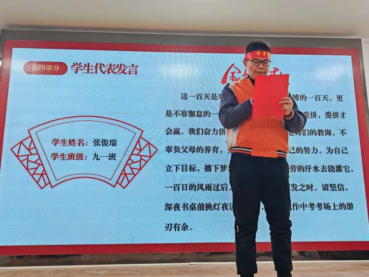 少年自有凌云志,百日鏖战定乾坤!学生代表张俊瑞和杜雨涵同学激情昂扬的讲话,激起了大家的共鸣。他们的发言铿锵有力,道出了全体九年级学子的决心!