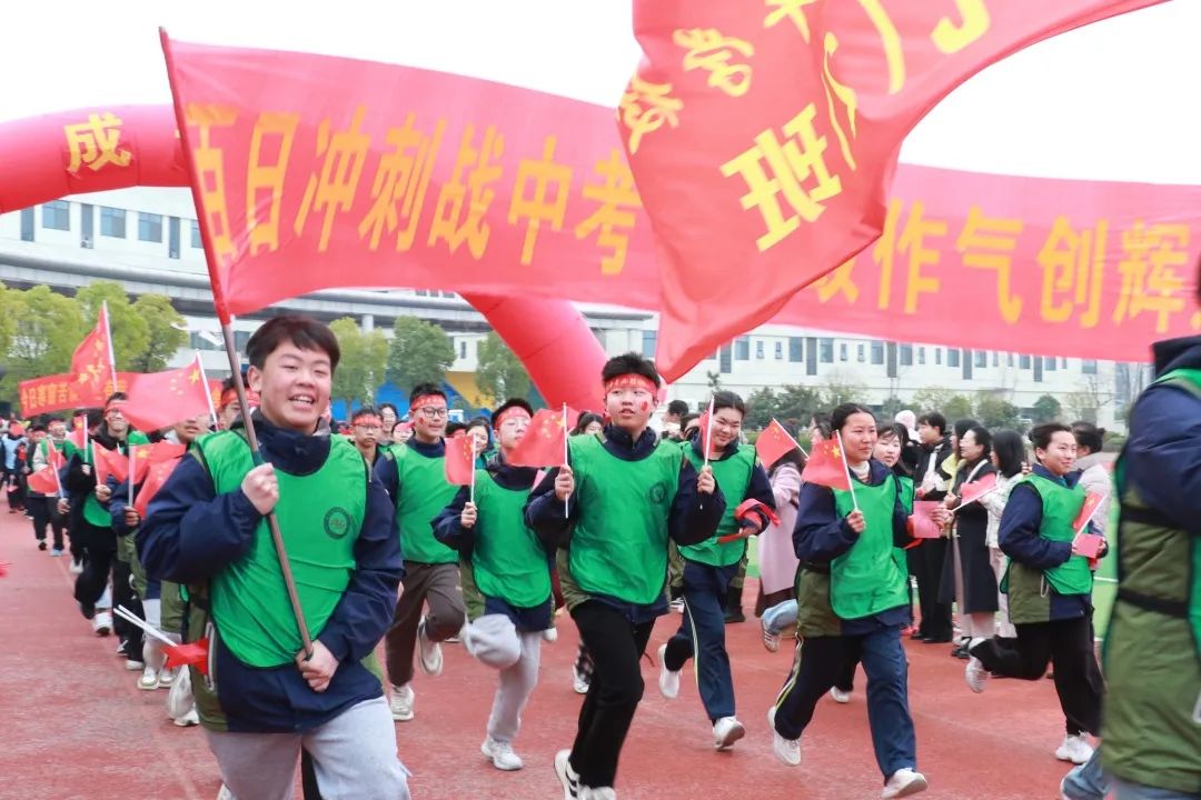 同学们高举本班旗帜,在教师的陪伴下,穿过五道寓意着美好希望的龙门,教师们口号铿锵、脚步坚定的入场,与学生一同迎战未来的一百天。
