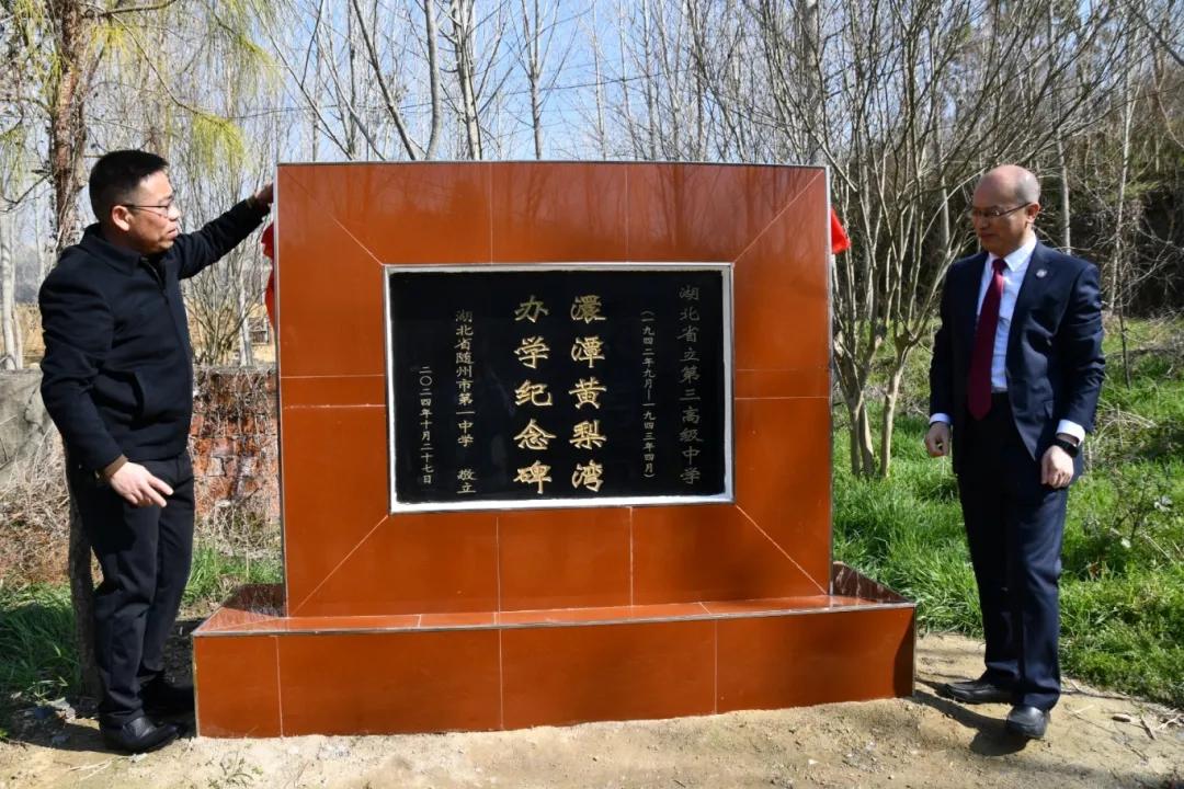 在随县澴潭镇殷张山村黄梨树湾办学旧址,梁勇与蒋玉铭共同为“澴潭黄梨树湾办学纪念碑”揭幕,沈德勇、殷张山村村委会主任张海波先后致辞。